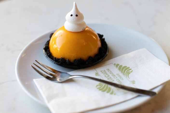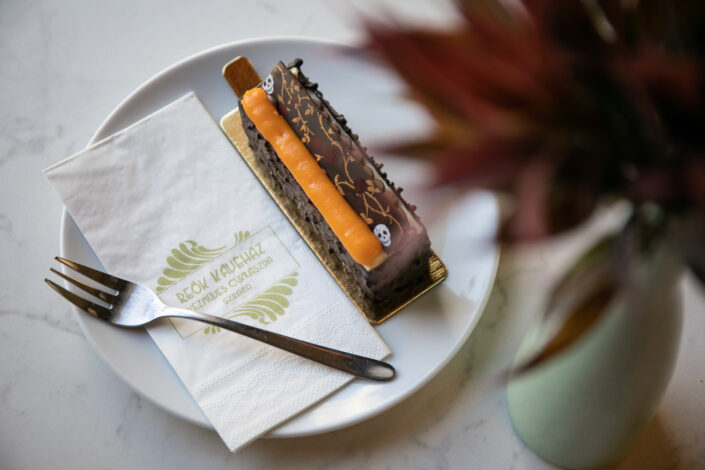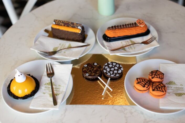 Az első és legfontosabb a Halloween Desszert, amelyet a fenti három összetevő mellett a mangó és a passiógyümölcs dominál. Roppan a mesteri csokoládémáz, olvad a szánkban a lágy sütőtök-narancs-csokikrém, közben pedig Ádám arról magyaráz, hogy a REÖK Cukrászda történetében először, a fekete kakaóport is bevetették. Mint mondja, ez nagy újítás, mi az egészből annyit éreztünk, hogy valami eszelősen finom az új desszert, de pontosan ezért van az, hogy nem lettünk cukrászok (Ő viszont igen és ez elég jó ötlet volt). Ha már francia cukrászda (ahol még a francia nagykövet, Pascale Adreani is megfordult anno), alap volt, hogy legyen sütőtök ízű macaron, viszont az ugyanezen zöldség zseléjéből készült ekleren nagyon meglepődünk.