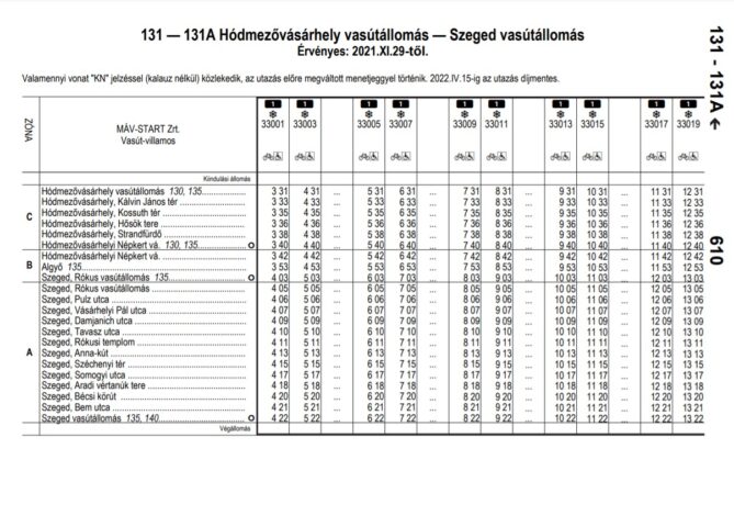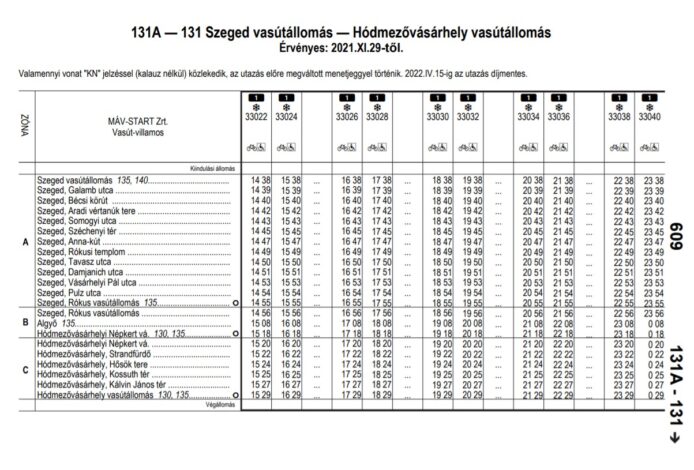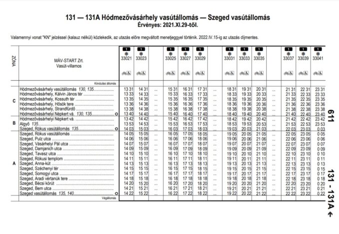 A MÁV által közzétett menetrenden azt is írják, hogy valamennyi vonat “KN” jelzéssel, azaz kalauz nélkül közlekedik, így az utazás előre megváltott menetjeggyel történik. Fontos tudni, hogy a tram-train április 15-ig ingyenes lesz. Lázár János legutóbb arra is kitért, hogy az ingyenes tesztidőt követően Szeged és Hódmezővásárhely között 465 Ft lesz a teljes árú jegy, ami jóval olcsóbb, mint a MÁV és a Volánbusz.