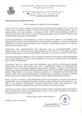 November elseje óta a munkaadóknak lehetőségük van a védőoltás felvételére kötelezni a munkavállalóikat, akik, ha megtadadják azt, fizetetlen szabadságra küldhetőek. “A kormányrendelettel magyarok százezrei kerülnek rendkívül nehéz anyagi helyzetbe a karácsony előtti időszakban” – írja nyílt levelében Ásotthalom polgármestere, egyben bejelenti, hogy átmeneti munkahelyeket hoznak létre olyan magyaroknak, akiket fizetés nélküli kényszerszabadságra küldtek.