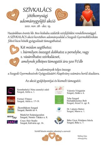 Számos szegedi vállakozás állt már a kezdeményezés mellé, ha tehetjük, vegyünk róluk példát. 9 szegedi, belvárosi gyűjtőponton, 2021. nov. 28-tól december 19-ig várnak mindenkit. Térjetek be Ti is a gyűjtőpontokra, , Szeged365 Family tagok és támogassátok a szívbeteg kicsik gyógyulását, melyet előre is hálás szívvel köszönnek a szervezők.