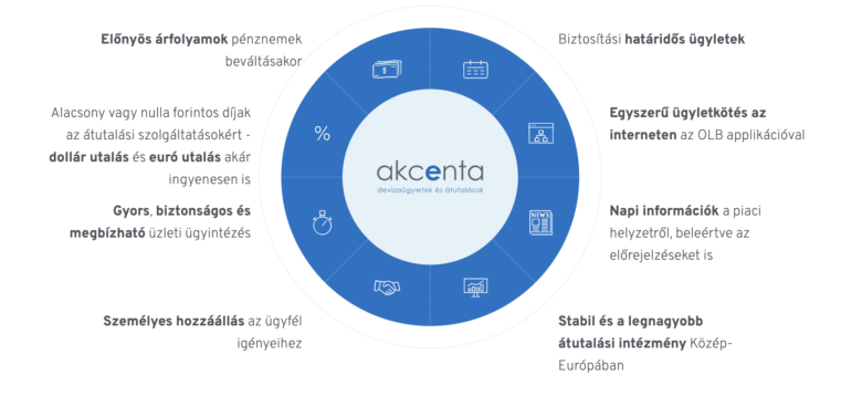 Az AKCENTA-nál van egy online felület, amelyben hétköznap fél 8 és fél 6 között önálló jogkörrel tud váltani az ügyfél (például Te, vagy a pénzügyes kollégád), bankár nélkül. Az is működik, ha rájuk bízod az árfolyamfigyelést: