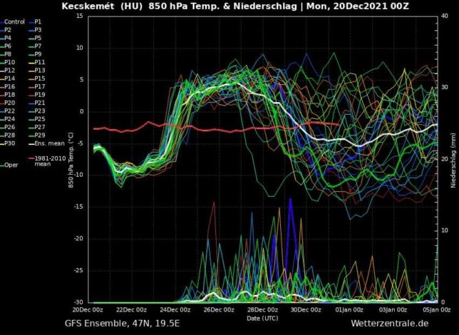 Karácsonyra aztán megérkezik az enyhülés. A magasban a felettünk lévő  -10, -12 fokos levegőt 2-6 fokos enyhe váltja fel. Ennek köszönhetően napközben 5 fok körül mérhetünk, míg Szeged környékén a 15 fokot is elérhetik a maximumok kifejezetten karácsony másnapján.