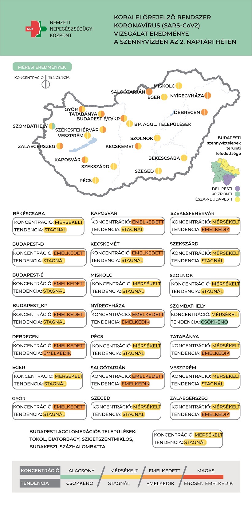 A SARS-CoV-2 örökítőanyag koncentráció 13 mintavételi helyen a mérsékelt, míg 9 településen az emelkedett kategóriába sorolható.