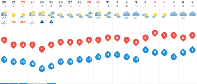 Csütörtökön észak-északnyugat felől egy erős hidegfront robog be hazánkba. A front előtt eső, havas eső és ónos eső is előfordulhat, majd a front érkeztével záporok tarkíthatják a napot Szegeden. A nyugatira, északnyugatira forduló szelet erős, viharos lökések kísérik majd. A legmagasabb hőmérséklet Szegeden 5 fok körül alakulhat, de a front mögött gyorsan visszaesik majd a hőmérséklet.