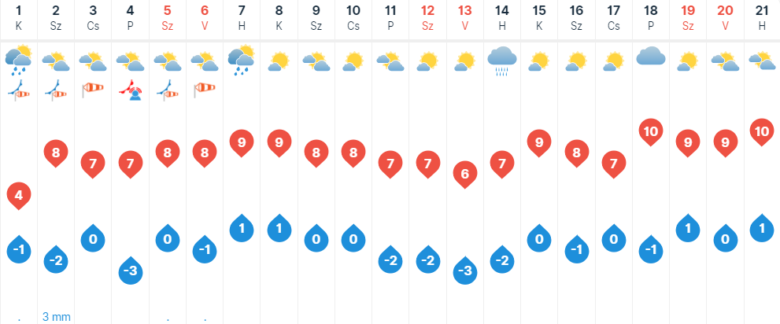 Szerdára virradó éjjel egy melegfront tör be térségünkbe, majd napközben erős, viharos északnyugati széllel újabb hidegfront érkezik Szegedre. A napos-gomolyfelhős időben ekkor elszórtan ismét lehetnek záporok. Hajnalban -1, majd napközben 8 fok körüli értékeket mérhetünk majd Szegeden.