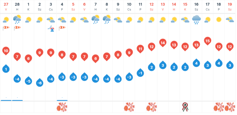Késő délután, este az északi tájakon alakulhat ki egy-egy zápor, hózápor, de szintén csak a dunántúli vidékeken van edélye a zord időjárásnak. Később felélénkülhet északi-északkeleti szél. Hajnalban +1, délután 10-11 °C-ot mérhetünk.