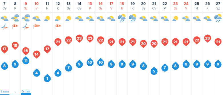 Csütörtök reggel már erősen felhős lehet az ég, és egy-egy zápor is kialakulhat Szegeden, majd délutánra már felszakadozhat a felhőzet, és visszatérhet a napsütés. A légmozgás többfelé élénk, néhol erős lesz. Hajnalban 7-9, délután 17-21 fok várható.