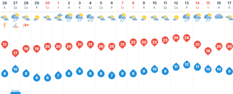 Kedden hosszabb-rövidebb időre kisüt majd a nap, de a megnövekvő gomolyfelhőkből délen, azaz Szeged környékén is előfordulhat zápor, egy-egy zivatar. Az előrejelzések szerint szél csak zivatarok környezetében támadhat fel. Napközben 16-22 fokot mérhetünk.