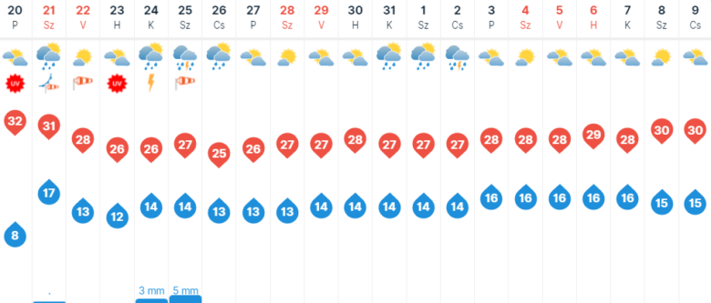 Szombaton napközben egy hidegfront érkezik, mely feltámadó északnyugati szelet, valamint a napos időszakok mellé elszórt záporokat, zivatarokat hoz. A front ellenére napközben még 27 és 33 fok közé melegedhet a levegő.