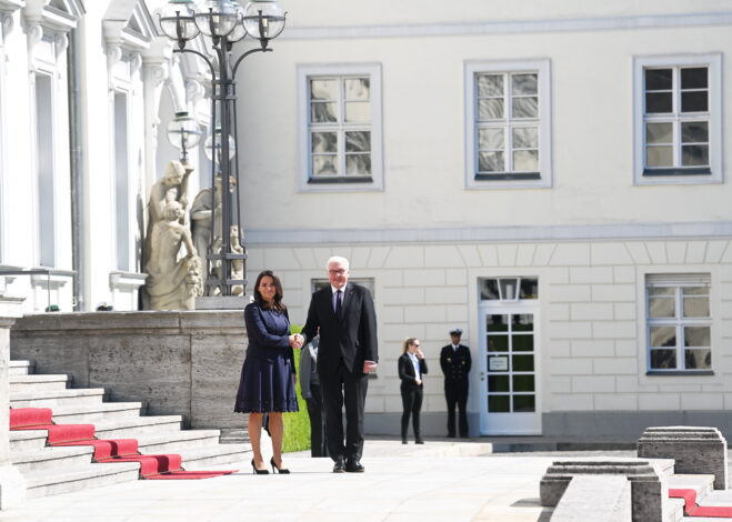 Berlin, 2022. június 3. Frank-Walter Steinmeier német államfõ és Novák Katalin köztársasági elnök kezet fog a berlini Bellevue elnöki rezidencián tartott fogadási ünnepségen 2022. június 3-án. MTI/Bruzák Noémi