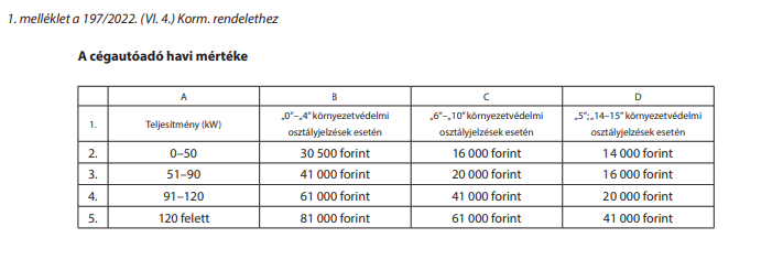 2022 július 1. és 2022. december 31. között – a gépjárműadóról szóló 1991. évi LXXXII. törvény 17/E. §-ától eltérően – a cégautóadó havi mértéke személygépkocsinként, a személygépkocsi kilowattban kifejezett teljesítménye és környezetvédelmi osztályjelzése alapján az 1. mellékletben meghatározott összeg.