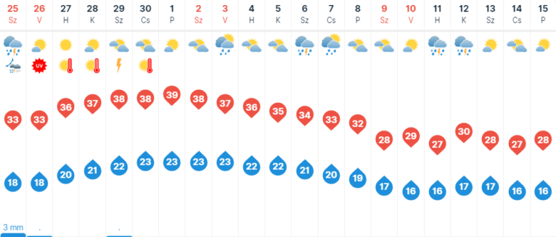 Vasárnap a napsütés lesz túlsúlyban, a megjelenő gomolyokból legfeljebb délkeleten fordulhat elő kevés zápor, esetleg zivatar, tehát lehet, hogy Szegedre is jut egy kis csapadék. A légmozgás többnyire gyenge, mérsékelt marad. Kora reggel 14-20, délután a legmelegebb órákban 30-36 fok várható.