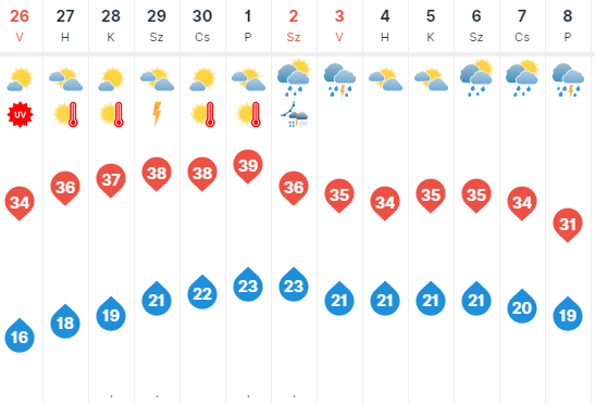 Ha még ez nem lenne elég keddre 37 fokot mondanak. Szerdára növekszik a hőség, de legalább a szél is megélénkül és 18 Km/h sebességre erősödik. A délutáni UV sugárzással, ami még mindig magas vigyázzatok magatokra. Szerda-csütörtökre zivatarokat ígérnek, majd látjuk mi lesz belőle.