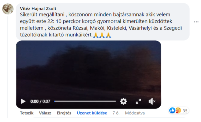 “Sikerült megállítani, köszönöm minden bajtársamnak akik velem együtt este 22:10 perckor korgó gyomorral, kimerülten küzdöttek mellettem. Köszönet a ruzsai, makói, kisteleki, vásárhelyi és a szegedi tűzoltóknak a kitartó munkáért” – írta a megjelent cikkünk kommentjében Zsolt, az egyik oltásban részt vevő tűzoltó, aki egy videót is posztolt.