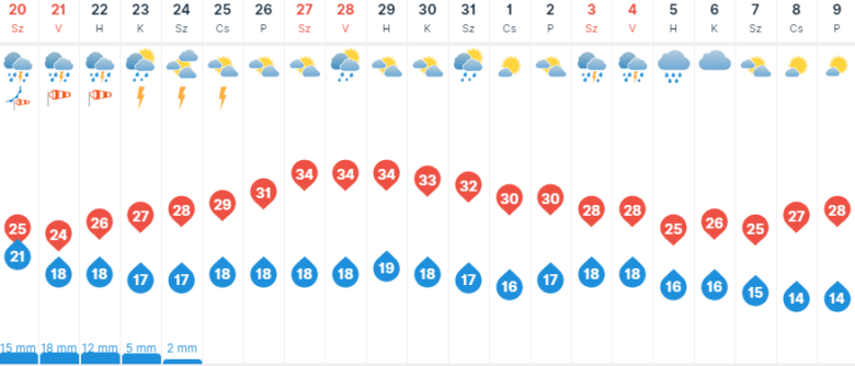 Vasárnap sok felhő lesz az égen, és ismét számítani lehet esőre, záporokra, zivatarokra, helyenként felhőszakadásra is. Az északias szél az ország nagy részén élénk, erős, olykor viharos lehet. Napközben 20-25 fokra van kilátás városunkban.