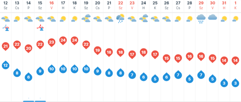 Csütörtökön kevesebb lesz a felhő, több a napsütés. Számottevő csapadék, jelentős légmozgás nem várható. Reggelre köd képződhet, amely délelőtt feloszlik. A csúcshőmérséklet 17 és 22 fok között alakul.