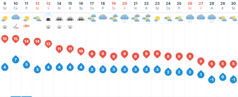 Csütörtökön túlnyomóan felhős, többfelé borult időre számíthatunk, de kezdetben délen, így Szegeden is még napos idő ígérkezik. Napközben egy hidegfront hatására több helyen fordulhat elő eső, zápor. Az északnyugatira forduló szelet több helyen kísérhetik élénk, néhol erős lökések. Hajnalban pára, köd ismét képződhet, 3-9 fokig hűl le a levegő. A csúcshőmérséklet 10 és 16 fok között alakulhat.