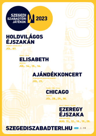 - Egy héttel később Michael Kunze és Lévay Sylvester régen várt musicalje, az Elisabeth érkezik három estére a Szabadtéri Játékokra. Az Erzsébet császárné életét színpadra álmodó, nagyívű előadás hazai ősbemutatójára 1996-ban éppen a Dóm téren került sor, és azonnal a szegedi közönség egyik legkedvesebb musicaljévé vált. A történet ezúttal a Kecskeméti Katona József Nemzeti Színház vendégelőadásában, Szente Vajk kiváló rendezésében kel életre a nagyszínpadon.