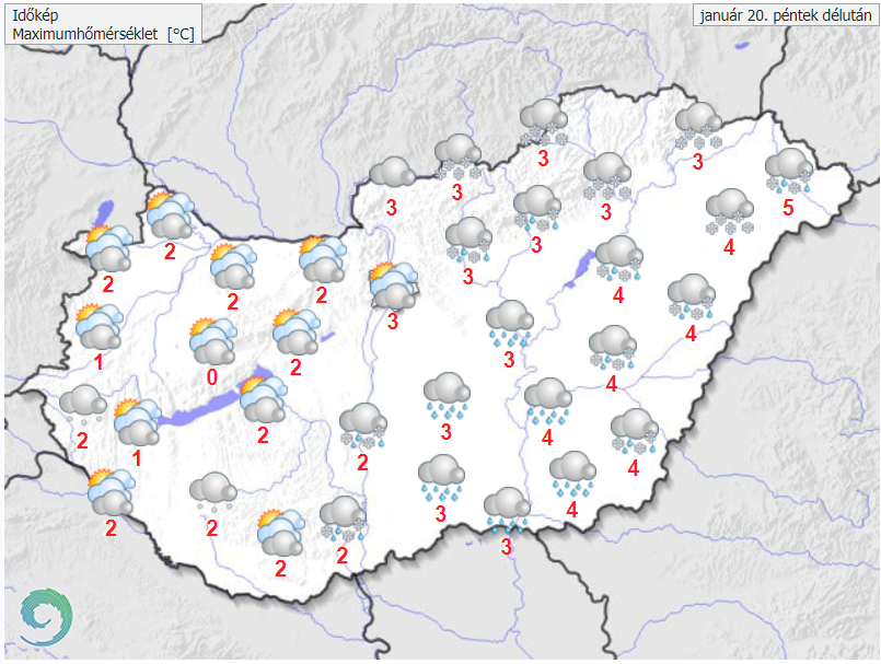 Szombaton is sok felhő lesz az égen, csak kevés helyen süthet ki rövid időszakokra a nap. Főként a nap második felében fordulhat elő dél felől több helyen hószállingózás, kisebb havazás, délen, délkeleten havas eső, eső. A Dunántúlon sokfelé erős, nyugaton viharos lesz az északi szél, emellett keleten, délkeleten az északkeleti szél lehet élénk. Reggel az ország nagy részén fagyni fog, a csúcshőmérséklet pedig -1 és +5 fok között alakul.