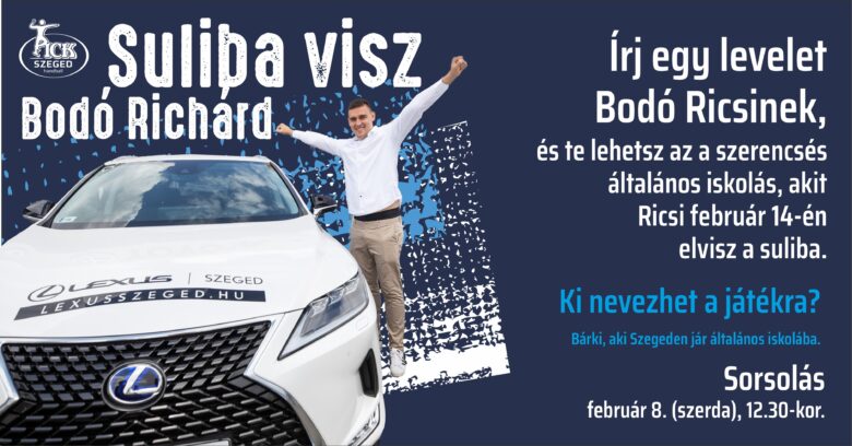 “Írj egy levelet Bodó Richárdnak, és te lehetsz az a szerencsés általános iskolás, akit Ricsi február 14-én elvisz a suliba” – írta felhívásában az OTP Bank – PICK Szeged, akik hozzátették, hogy 2017-ben Stas Skube, 2018-ban Zubai Szabolcs vitt el egy-egy szerencsés szegedi általános iskolást a suliba. A játék újra indul, a főszerepben Ricsivel.