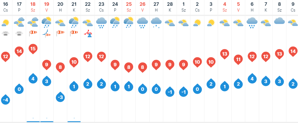 Pénteken megnövekszik a felhőzet és több tájegységünkön elszórtan kialakulhat időnként kisebb eső, egy-egy zápor. A nyugati-délnyugati szél több helyen élénk, néhol erős lehet. A hajnal enyhébb lesz, de többfelé képződhet pára, köd. A csúcshőmérséklet 14 fok körül alakulhat Szegeden.