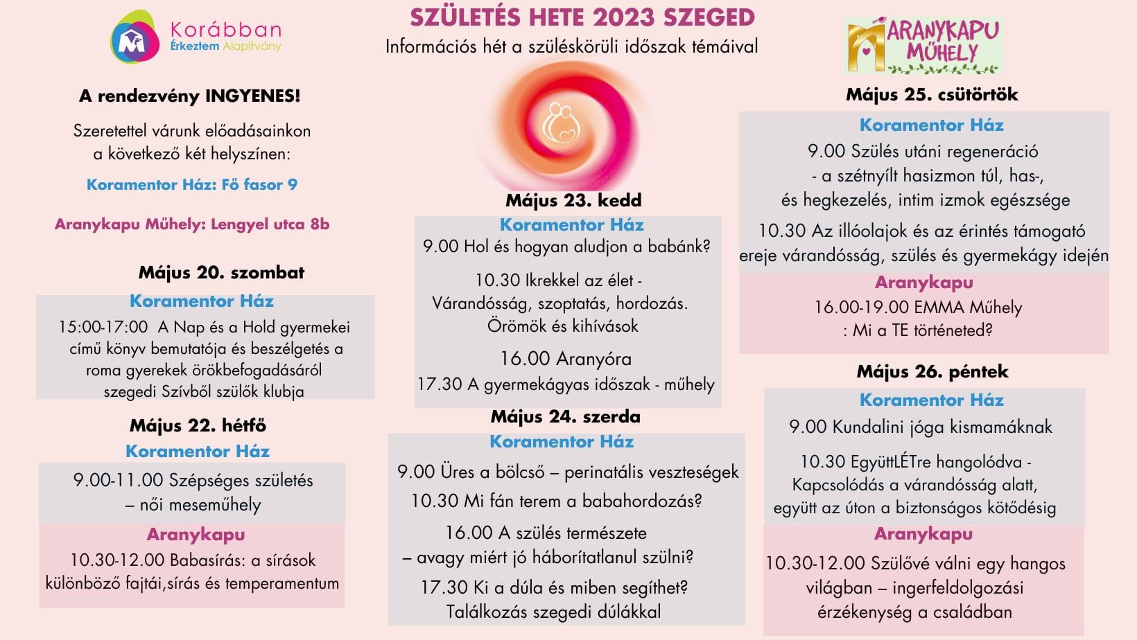 A csoport májusi programja a Születés Hete rendezvénysorozathoz is kapcsolódik, ugyanis Gubcsi Judit – Mártonffy Zsuzsa: A Nap és a Hold gyermekei – Roma gyermekek örökbefogadása Magyarországon című hiánypótló könyvbemutatóját rendezik meg május 20-án szombaton 15:00-tól a szegedi Koramentorházban.