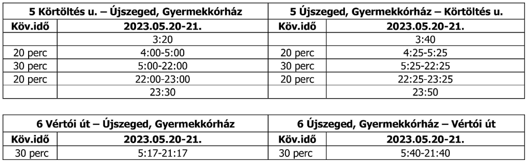 Az 5-ös és 6-os vonali járatok a Széchenyi tér (Kelemen u.) megállóhelyet egyik irányban sem, Újszeged, Gyermekkórház irányban az eredeti Torontál tér (P+R) megállóhelyet és a Csanádi utca megállóhelyet nem érintik.