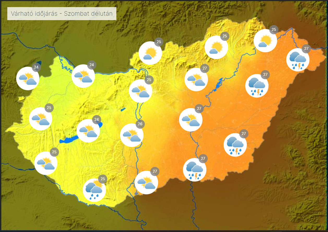 Gomolyfelhős, napos időre számíthatunk szombaton. Az OMSZ előrejelzése szerint a képződő gomolyfelhőkből elsősorban délen, délnyugaton valószínű helyenként záporeső, zivatar, emellett délután a keleti, délkeleti határ és akár Szeged környékére is sodródhatnak záporos, zivataros gócok. Este a legtöbb helyen csökken a csapadékhajlam. Az északi, északkeleti szelet több helyen élénk, néhol erős lökések is kísérhetik. A legmagasabb nappali hőmérséklet 22 és 27 fok között várható Szegeden.