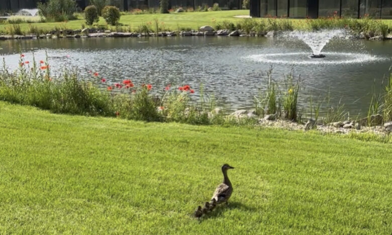 Ma este pedig az Európa Liga kezdete előtt néhány perccel befutott a nap legcukibb videója: kacsamama a Cédrus Liget Lakópark belső gyönyörű parkjában totyog kacsamama a kicsinyeivel: