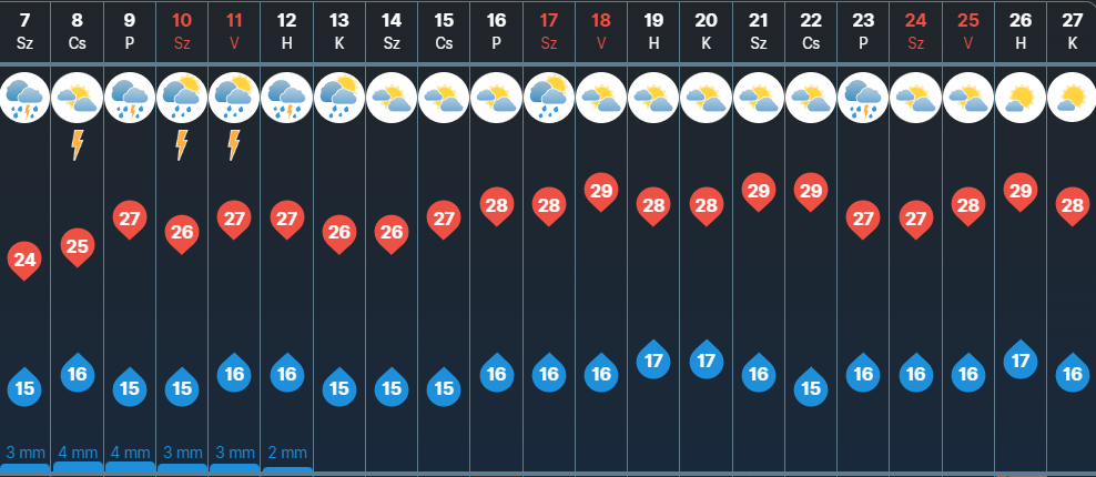 Szerdán a gomolyfelhős-napos időben elszórtan ismét számíthatunk esőre, záporokra, zivatarokra. Utóbbiakat néhol felhőszakadás, jégeső kísérheti. Keleten zivataroktól függetlenül időnként élénk lehet a déli szél. Délutánra 23-24 fok köré melegszik a levegő hőmérséklete Szegeden.