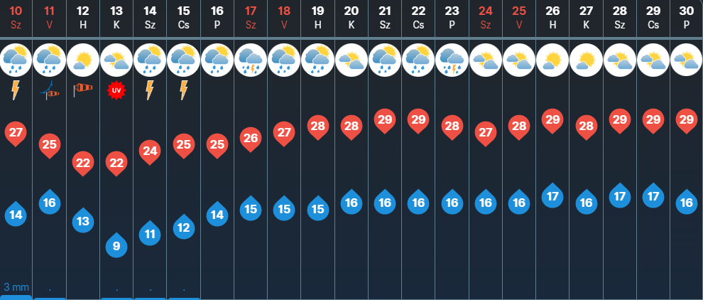 Szombaton gyakran zavarhatják gomolyfelhők a napsütést, és továbbra is számítani kell időnként záporok, zivatarok kialakulására, de akár felhőszakadás is előfordulhat. Az északi-északkeleti szél helyenként zivataroktól függetlenül is megélénkülhet. Reggelre ismét többfelé képződhet pára, köd. Délután 22-28 fokot mutathatnak a hőmérők Szegeden.