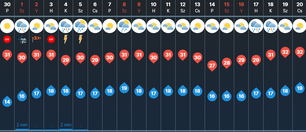 Szombaton egy hidegfront hatására több helyen is előfordulhat zápor, zivatar a napos időszakok mellett. Sokfelé élénk lehet a nyugati-északnyugatira forduló szél. A legmagasabb hőmérséklet 24 és 32 fok között alakulhat.