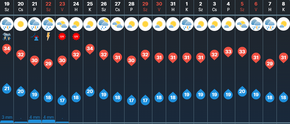 Szerdán egy hullámzó hidegfront közelíti meg térségünket, így többfelé lehetnek záporok, zivatarok, helyenként heves zivatarok, amelyekhez jégeső, felhőszakadás társulhat. A nyugatias szél többfelé megélénkülhet, északnyugaton helyenként megerősödik, zivatarok környezetében azonban viharos lökések is lehetnek. A csúcshőmérséklet 28 és 36 fok között alakulhat Szegeden.