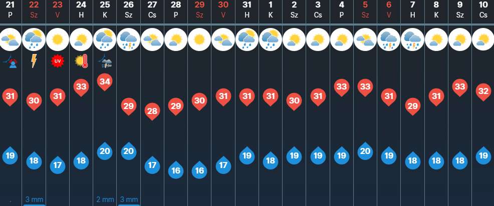 Szombaton eleinte napos idő várható, majd nyugat felől erősen megnövekszik a felhőzet és egyre többfelé kialakulhatnak záporok, zivatarok. A szél zivatarok idején feltámad, erős, viharos lehet. A maximumok 27 és 31 fok között alakulhatnak.