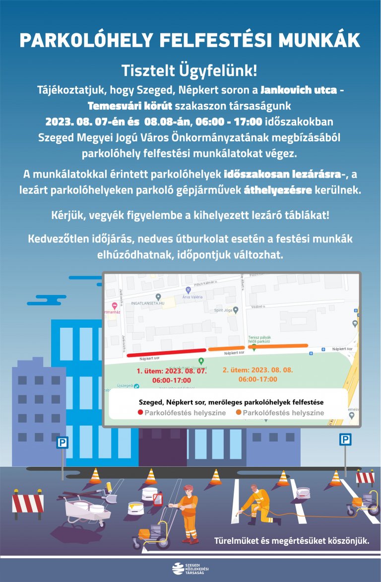 A munkálatokkal érintett parkolóhelyek időszakosan lezárásra, a lezárt parkolóhelyeken parkoló gépjárművek áthelyezésre kerülnek. Kedvezőtlen időjárás, nedves útburkolat esetén a festési munkák elhúzódhatnak, időpontjuk változhat – tették hozzá.