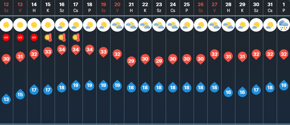 Vasárnap a délire forduló szél még melegebb levegőt hoz felénk, a maximumok 27-32 fok között alakulnak. Felhő alig lesz felettünk, igazi strandidő várható.