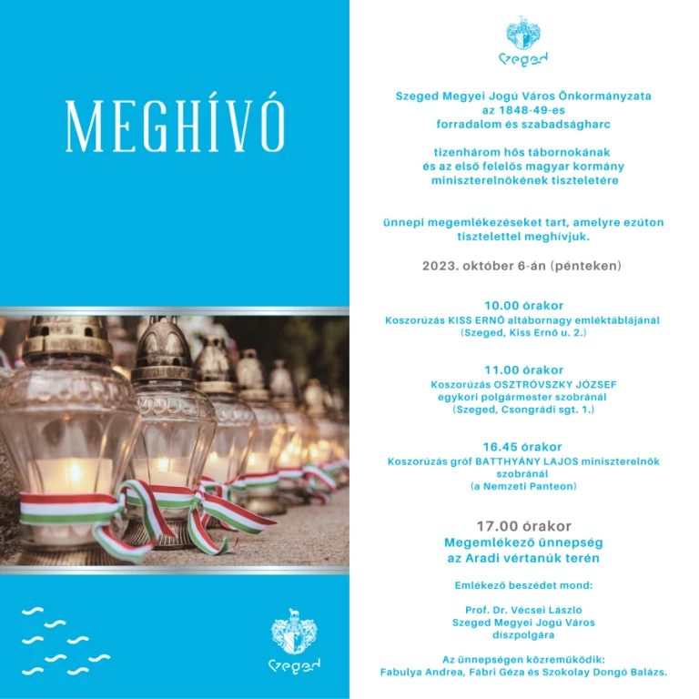 Ahogy minden évben, úgy idén szerveznek megemlékezéseket és koszorúzásokat Szegeden. Az önkormányzat reggel 10-kor Kiss Ernő emléktáblájánál koszorúzott, majd 11-kor Osztróvszky József egykori polgármester szobránál. 16.45-kor lesz koszorúzás Batthyány Lajos miniszterelnök szobránál, 17.00-kor pedig megemlékező ünnepség az Aradi vértanúk terén.
