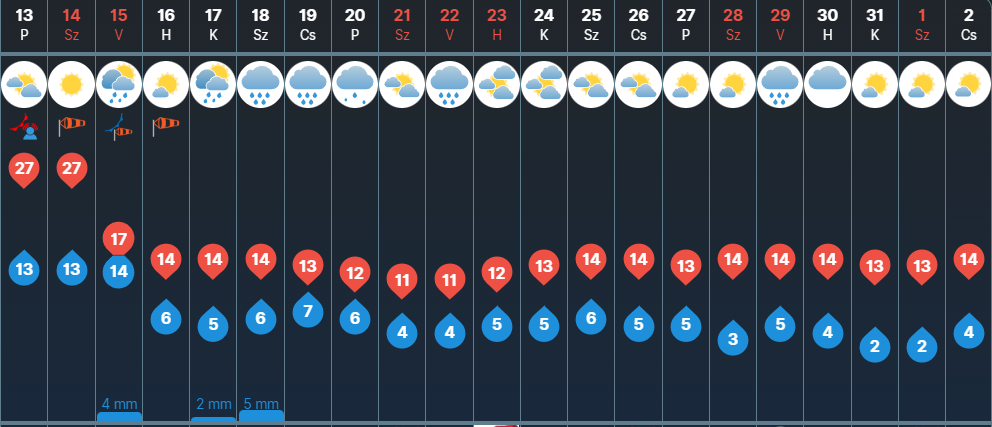 Szombaton a reggeli pára- és ködfoltok feloszlását követően napos, száraz idő ígérkezik, legfeljebb estefelé északnyugaton alakulhat ki néhol zápor, esetleg zivatar. Többfelé élénk, helyenként erős lehet délnyugati szél. Napközben 23 és 28 fok közé melegedhet a levegő.