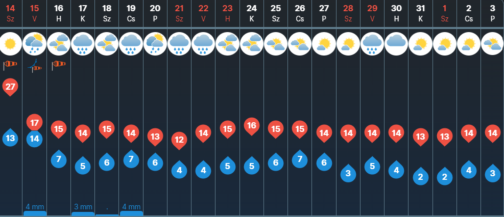 Vasárnapra egy erős hidegfront érkezik, amelynek hatására északnyugat, nyugat felől megnövekszik felettünk a felhőzet, és többfelé eső, zápor is kialakulhat. Az élénk, erős, helyenként viharos északi-északnyugati szélben már csak 11-20 fokot mutathatnak napközben a hőmérők, ám még így is délkeleten lesz a legmelegebb.