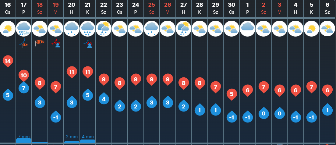 Pénteken sok lesz a felhő fölöttünk és többfelé várható eső, zápor, helyenként zivatar. Mérsékelt, több helyen élénk lesz a délies szél, délutántól pedig megerősödik, viharossá fokozódik az északnyugati szél. A csúcshőmérséklet 7 és 13 fok között alakulhat.