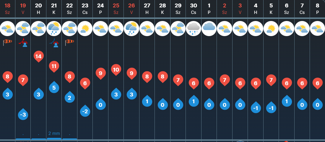 Vasárnap egy melegfront felhőzete érkezik fölénk, több helyen előfordulhat kisebb eső. A délire-délnyugatira forduló szél veszít erejéből, csak helyenként lehet élénk. Kora reggel már -3 fokot jósolnak Szegedre, napközben pedig csak 7 fokot mérhetünk majd városunkban.