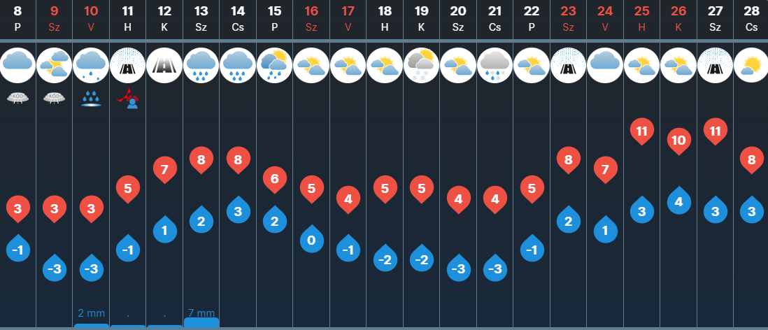 Péntekre sokfelé képződhet köd, zúzmarás köd, valamint rétegfelhőzet, amely néhol tartósan megmaradhat. Számottevő csapadék nem várható, de kisebb hószállingózás, szitálás előfordulhat a borongós területeken. Hajnalban -1 és 0, napközben 2-3 fok körül alakul a hőmérséklet Szegeden.