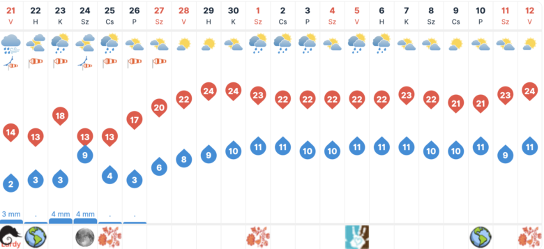 Hétfő éjszaka már megérkezett az eső, esőcseppek kopogtathatták az ablakainkat. Hajnalra-kora reggelre eláll az eső, de felhős marad az ég. Az egész délelőtt borongós lesz, azonban kora délutánra felszakadozhat a felhőzet és előbújhat a napocska. Hajnalban 3, napközben 13 fokig melegszik az idő.