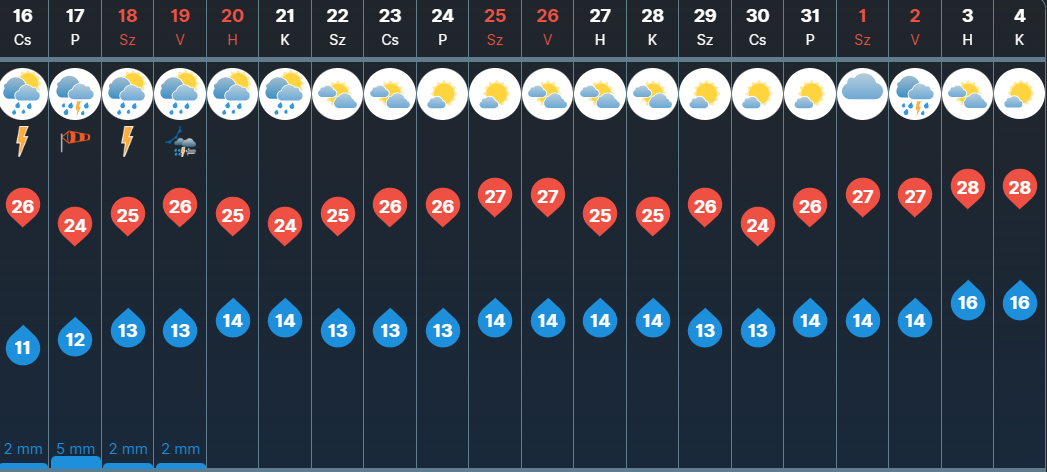 Csütörtökön a megnövekvő gomolyfelhőkből elszórtan alakulhatnak ki záporok, néhol zivatarok. A délkeleti szelet már több helyen erős, helyenként viharos lökések kísérhetik. A csúcshőmérséklet 21-27 fok között valószínű.