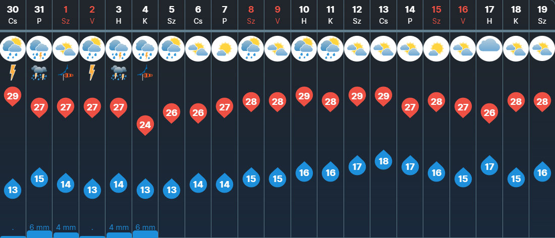Csütörtökön a napsütést többfelé zavarhatják meg gomolyfelhők. Kezdetben keleten-északkeleten, később már egyre többfelé alakulhatnak ki záporok, zivatarok. Néhol ismét számítani kell felhőszakadásra, jégesőre. Helyenként élénk lesz a nyugati-északnyugati szél, de a zivatarok környezetében erős, viharos széllökésekre is fel kell készülni. A csúcshőmérséklet 23 és 30 fok között alakul majd Szegeden.