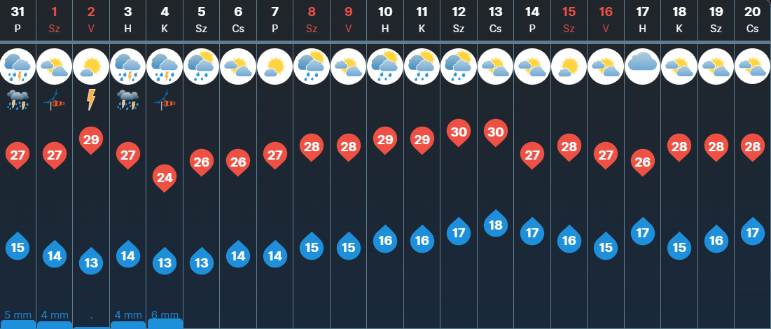 Szombaton a napos-gomolyfelhős időben még többfelé kialakulhatnak záporok, zivatarok, helyenként felhőszakadás, jégeső. Élénk, erős, zivatarok környezetében viharos lesz a déli-délnyugati szél. A legmelegebb órákban 22-29 fokot mutathatnak a hőmérők.
