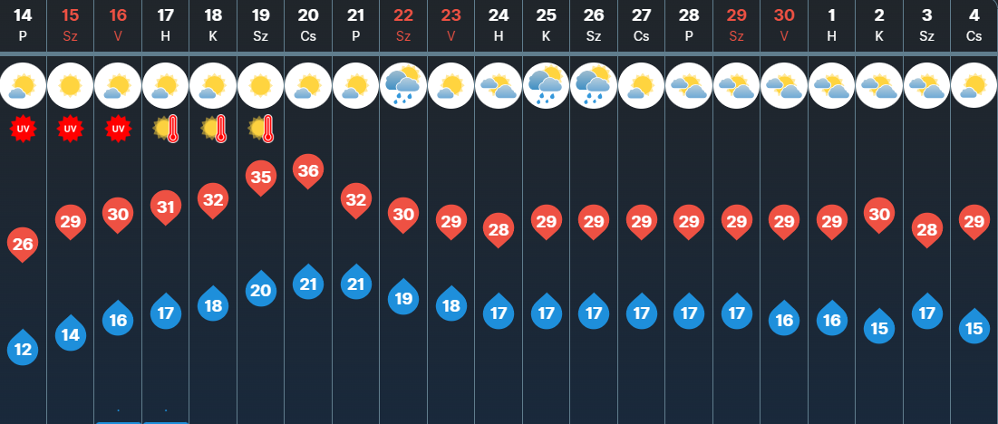 Szombaton kevés felhő, sok napsütés várható. Csapadékra sem kell számítani, így igazi strandidőnk lesz Szegeden. A délire forduló szelet a helyenként élénk lökések kísérhetik. A hőmérséklet délután már 25 és 30 fok közé emelkedik. Folyamatosan melegszik majd az idő, így jövő héten már beköszönthet az első hőhullám is városunkba.