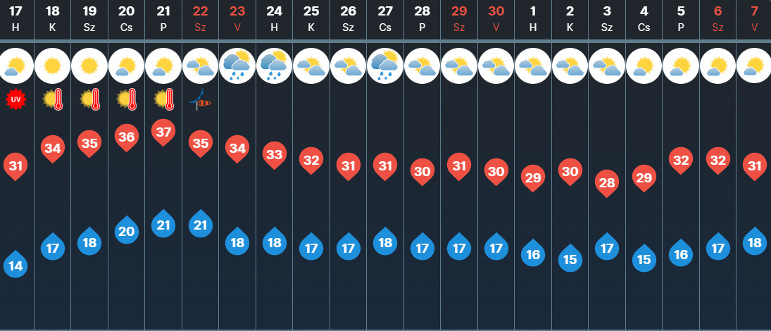 Kedden és szerdán is sok napsütésre számíthatunk, egy-egy jelentéktelen zápor legfeljebb kedden fordulhat elő. Kedden nyugaton és északnyugaton, szerdán viszont már többfelé élénk lehet a déli-délkeleti szél. Érkezik a kánikula: kedden 28 és 34, szerdán már 31 és 37 fok között alakulhat a csúcshőmérséklet.