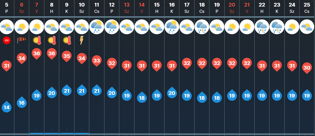 Szombaton sok napsütésre, és csapadékmentes időre számíthatunk. Sokfelé élénk, erős, néhol viharos lesz a déli-délkeleti szél. Visszatér a kánikula, a csúcshőmérséklet 30 és 35 fok között alakul.