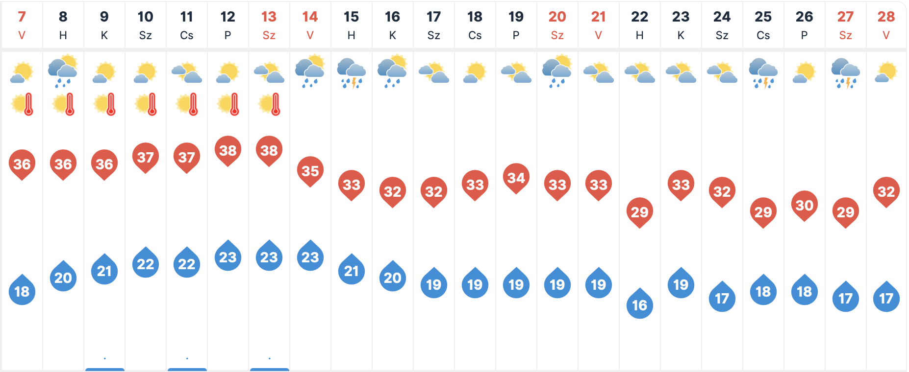 Már 23 fokban indulhatunk a munkába, szóval pulcsira nem lesz szükség. Késő délelőtt beborulhat az ég és jöhet egy kis gyenge eső. Délutánra felszakadozhat a felhőzet és újból előbújik a nap. Az UV sugárzás továbbra is magas lesz a városban. Napközben 36 fok lesz.